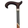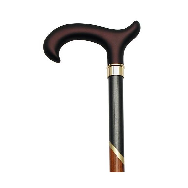 Derby handle-satin brown soft touch, metallic anthradite/gold/scorched and cherry stained hardwood shaft, high gloss finish with brass ring, 36" long with rubber tip.