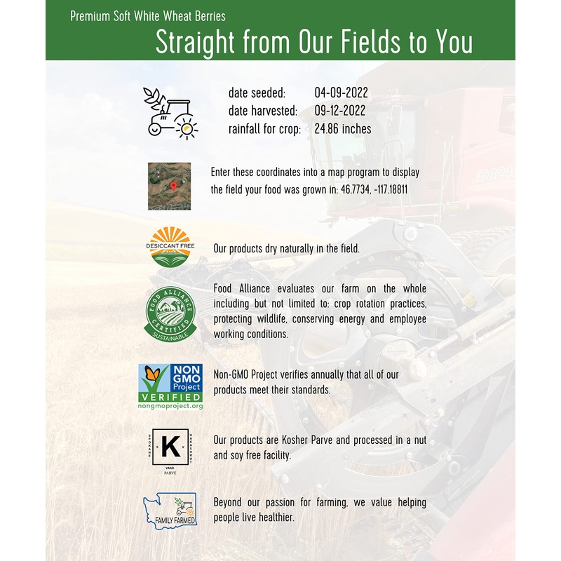 - PROUDLY GROWN ON OUR FARM: Palouse Brand Soft White Wheat Berries are proudly grown on our farm to provide our customers with an authentic farm to table experience. We grow our wheat berries on our 125 year old farm, harvest them, transport them, triple clean, and package them to be sent directly to our customers.