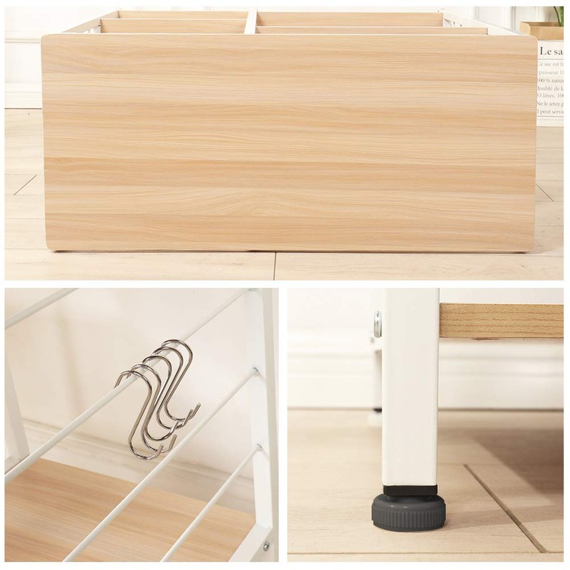 - 【Large Storage Space】: 4-Tier+3-Tier shelves can store spice, dishes,toaster, micorwave oven and etc.Five little hooks make it easier to hang cooking tools like pots, pans, utensils and etc.X frame design adds more stability and durability of the rack.