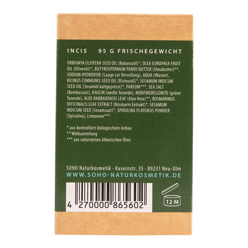 - Handmade in Germany – Our SOHO Naturkosmetik soaps are made with love in our soap factory in Bavaria. For our soaps use only natural ingredients without synthetic additives. Our soaps are vegan, plastic free, palm oil free and sustainable. Our soaps are deliberately not rounded to avoid waste.