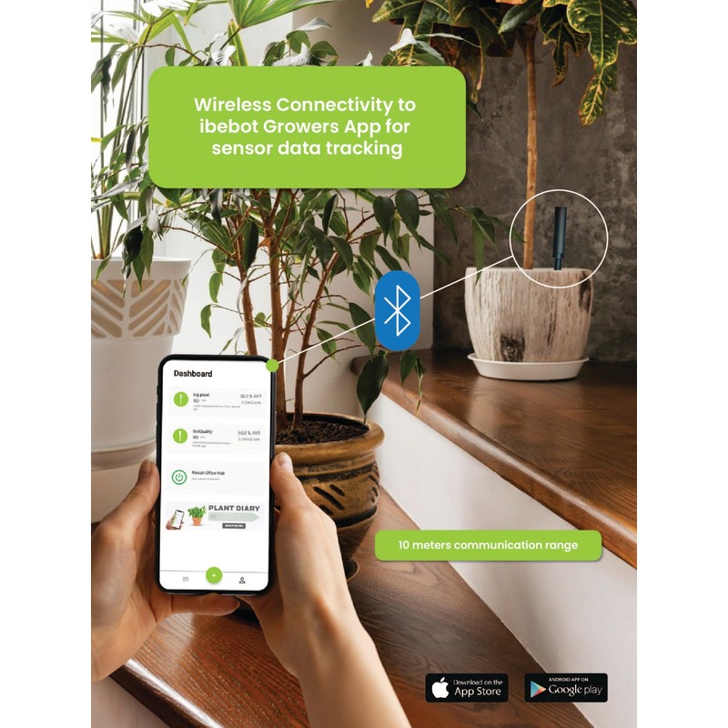 - Wireless Connectivity: Connect the SoilQuality to ibebot Growers App via Bluetooth to access accurate sensor data readings. Maintain a 10 meters connectivity distance from the SoilQuality. Remember to keep the mobile Bluetooth, internet connectivity and location ON to sync the data completely.