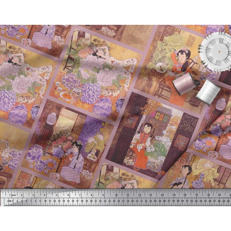 Soimoi Polyester Crepe Fabric Flower Vase,Cat & Girl Patchwork Print Fabric by The metre 52 Inch Wide