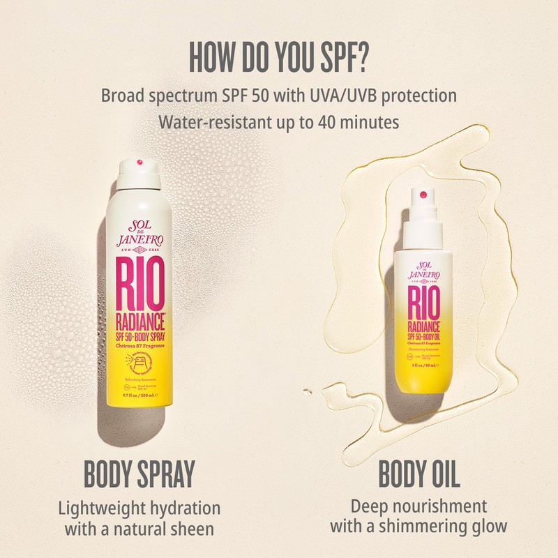 - The ultimate Rio Radiance glow. This SPF 50 dry shimmering non-greasy body oil deeply nourishes with pataua oil while pongamia seed extract helps protect skin from environmental aggressors. Golden mica instantly adds a gorgeous shimmer that looks beautiful on all skin tones. Bask in our beachy & nostalgic Cheirosa 87 scent with fragrance notes of solar tuberose, creamy coconut, and vanilla.