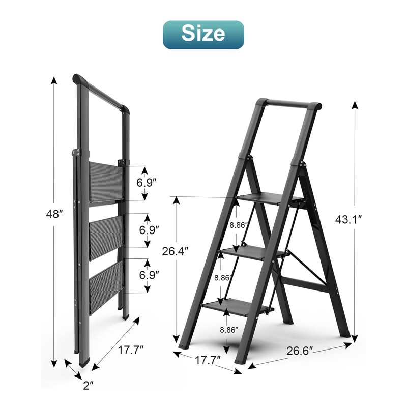 Wide Step Stool - The ladder has an oversized top platform to provide safe, stable and comfortable standing space. All steps size: 6.9 " X 13.19". Safety and Stability - The aluminum alloy frame structure of the ladder is strong and durable, and the whole beam is placed inside the column to ensure double load bearing effect, bearing capacity: 330 pounds.The top handrail design ensures the safety of the ladder. Anti-Slip Pedals and Rubber Feet - The pedal design has a non-slip pattern to increase friction and prevent the sole of the foot from slipping.The four rubber feet at the bottom of the ladder can prevent the ladder from sliding and scratches on the floor. Space Saving - This step ladder can be folded compactly and placed in a narrow place in a garage, under a bed, or in a convenient corner. Easy to store and carry. Unfolded: 17.7"L X 26.6"W X 43.1"H, Folded: 17.7''L X 2"W X 48"H, Net Weight: 9.2 lbs. Widely Used - As a tool to reach extra height, the folding step stool is perfect for the kitchen, bedroom, library, classroom, garage. The folding ladder can also be a decorative ladder, which can be used as a book shelf, flower shelf, etc.