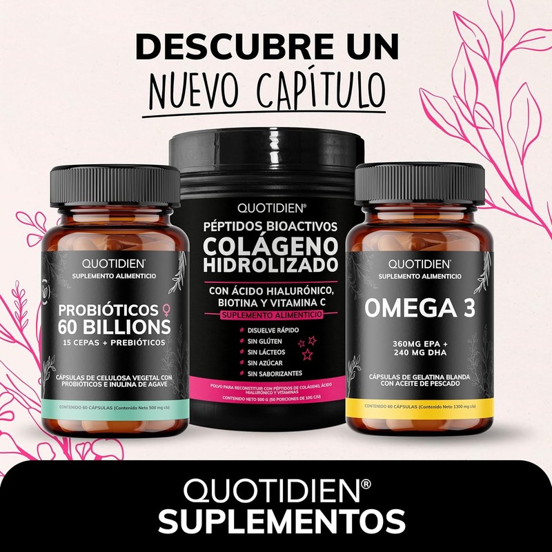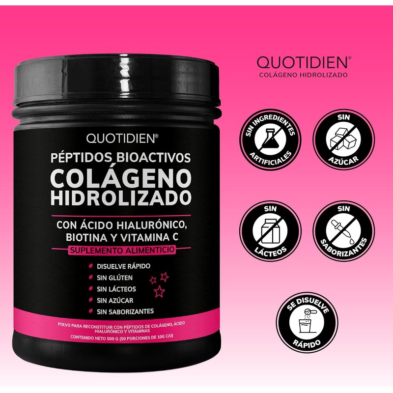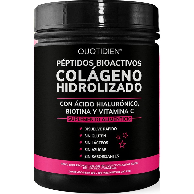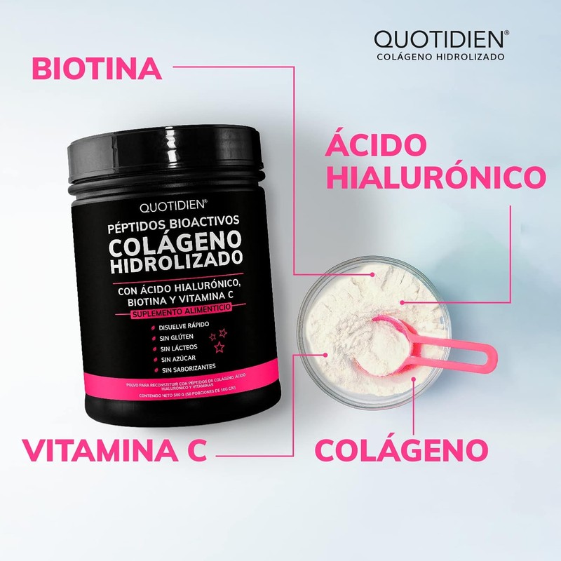 • PÉPTIDOS BIOACTIVOS DE COLÁGENO HIDROLIZADO: En Quotidien utilizamos Péptidos Bioactivos de Colágeno en polvo específicamente diseñados para la piel, cabello y uñas. Este suplemento combina Péptidos Bioactivos de Colágeno Hidrolizado, Biotina, Vitamina C y Ácido Hialurónico. Lleva tu rutina de cuidado facial al próximo nivel. La belleza es natural.