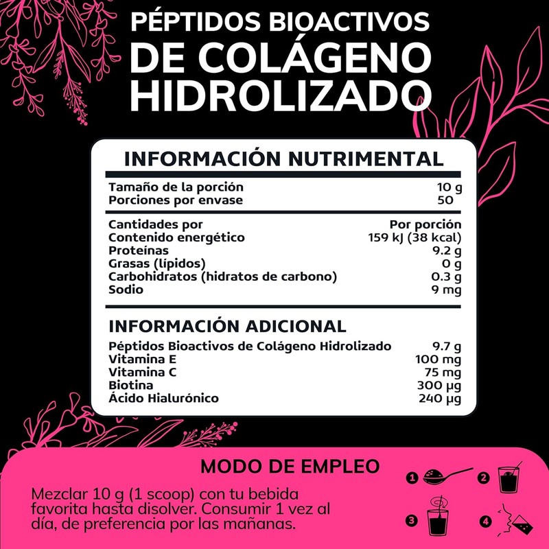 • INGREDIENTES SELECCIONADOS: Seleccionamos ingredientes premium para brindar una fórmula completa. Este producto contiene Péptidos Bioactivos de Colágeno Hidrolizado + VITAMINA C:potencia la absorción del colágeno y ácido hialurónico, + ÁCIDO HIALURÓNICO: Conocido por retener grandes cantidades de agua en la piel e hidrata profundamente + BIOTINA: suele utilizarse para el fortalecimiento de la piel y uñas.