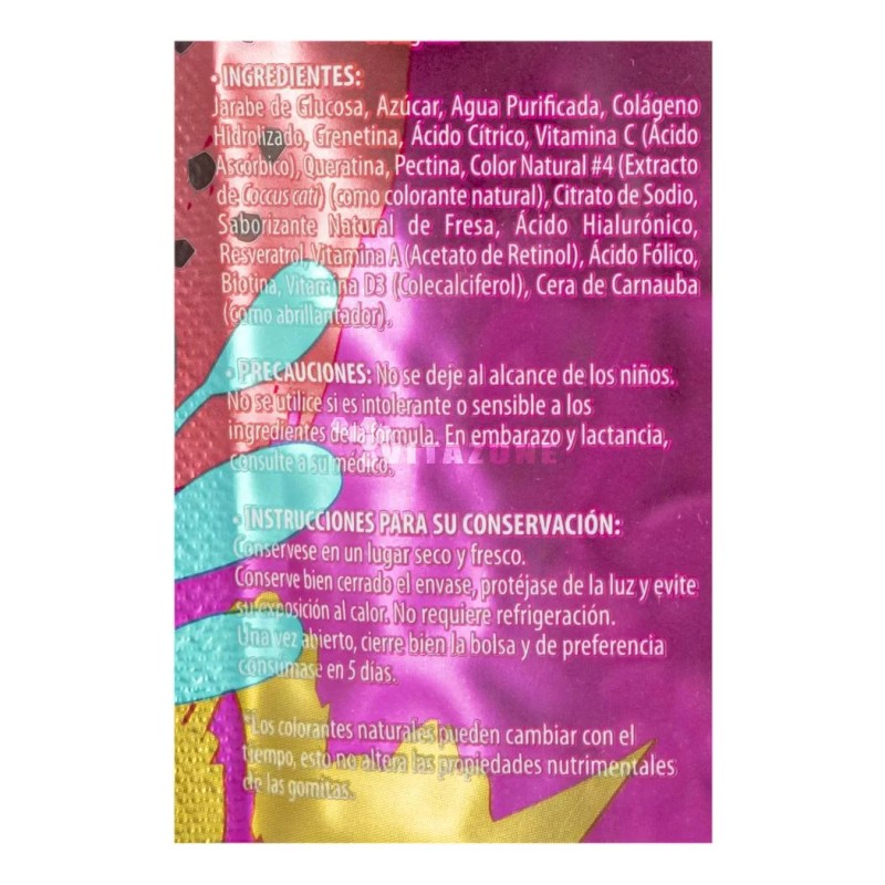 • Ingredientes: Agua purificada, Azúcar, Citrato de sodio, Color natural #4 (extracto de coccus cati) (como colorante natural), Colágeno hidrolizado, Grenetina, Jarabe de glucosa, Pectina, Queratina, Saborizante natural de fre, Vitamina c ácido ascórbico, Ácido cítrico