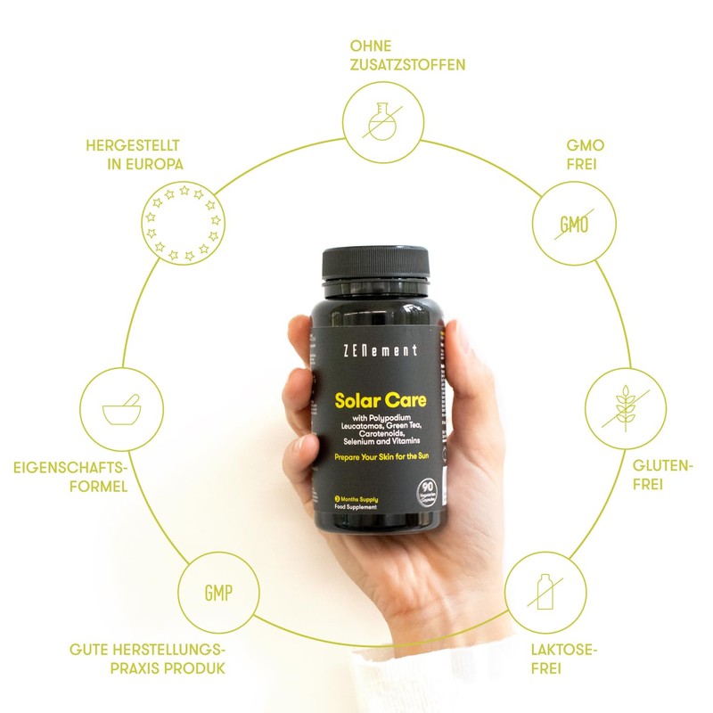 • Beta carotene complex: thanks to the combination of active ingredients, the solar care tanning tablets ensure that even light skin is ready for sunny days. ß-carotene, calaguala, green tea and carotenoids naturally give the skin a tanned complexion. At the same time, vitamin E, C, D and selenium protect the skin from harmful effects of the sun and above all premature ageing. A highly effective combination of active ingredients in a single tanning capsules