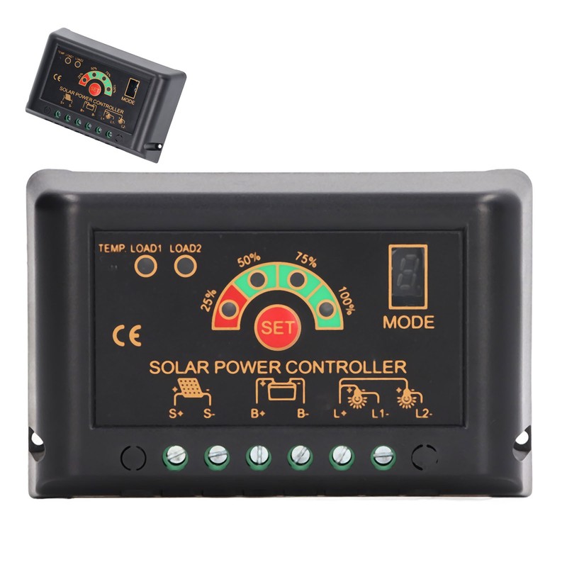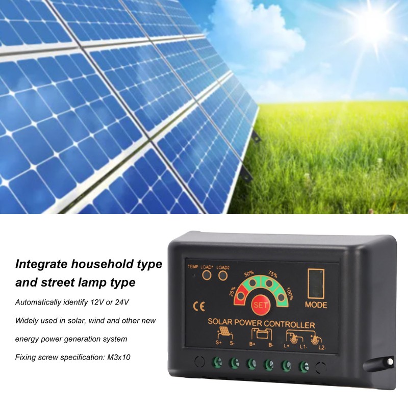 1、Wide Compatibility: This solar charge controller is widely compatible with a variety of battery types, such as ternary lithium batteries, lithium iron phosphate, etc. 2、Automatic Voltage Identification: This solar charge regulator integrates household type and street lamp type, and can automatically identify 12V or 24V 3、Multiple Protection: This solar charging controller has multi protection of reverse connection, over discharge, over current, over charge, short circuit and power down, which is stable and reliable 4、ABS Material: This solar panel controller is made of high quality ABS material, which has high strength and long last durability 5、Application: This solar charge controller is widely used in new energy power generation systems such as solar energy and wind energy