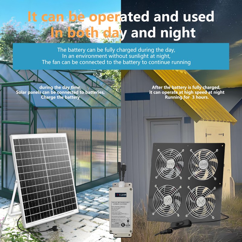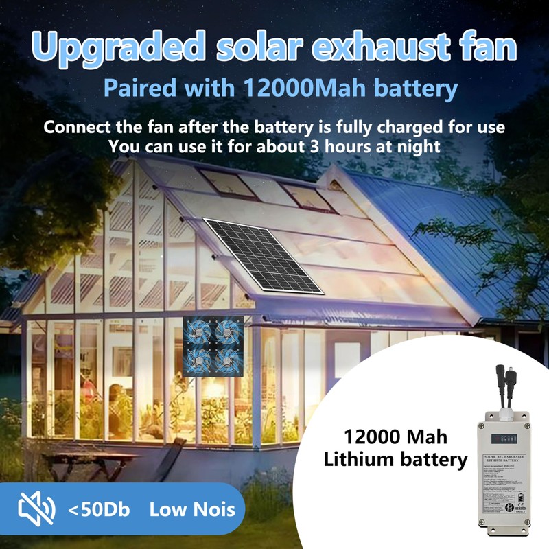 - 【Solar Fan with Battery】: The solar greenhouse fan is equipped with a high-capacity 12,000mah battery. When fully charged, it can run for 12-15 hours (requiring 6-7 hours of sunlight exposure). This solar ventilation fan continues to operate after sunset to ensure ventilation and cooling in the greenhouse throughout the night.