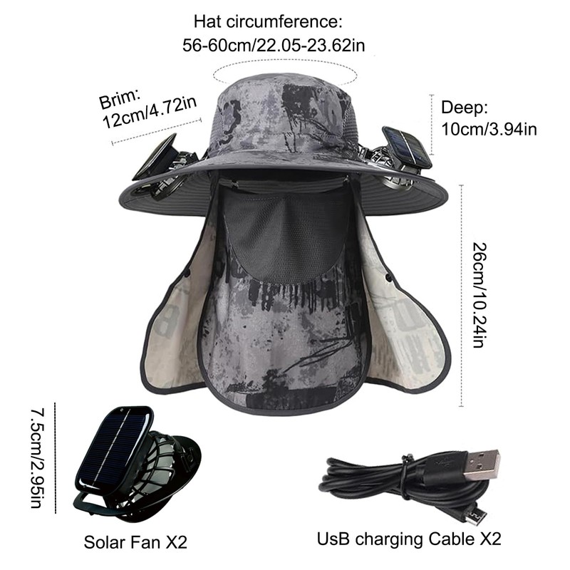 Solar Fan Hat, Wide Brim Solar Fan Outdoor Fishing Hat with Removable Neck Flap and Face Cover for Fishing, Hiking, Camping Grey