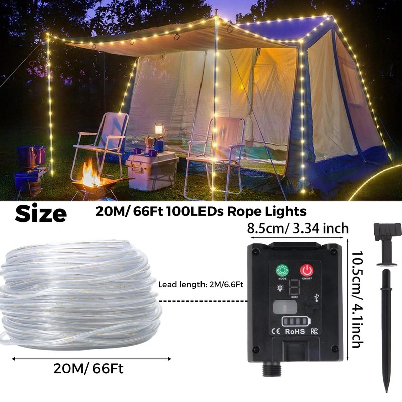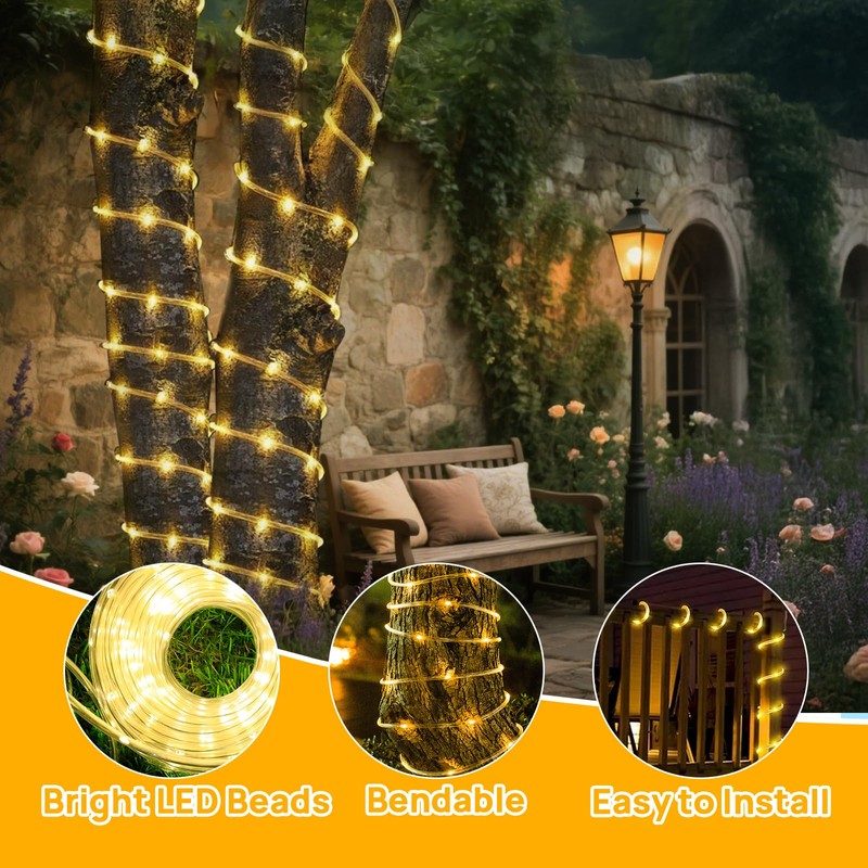 - 🌟【Solar Rope Lights】: Die Lichterkette ist 20 m lang mit einem 2 m langen Anschlusskabel und 200 LEDs. Die leuchtenden LEDs mit einem stabilen 360-Grad-Betrachtungswinkel strahlen in alle Richtungen. Die Lichtschläuche der Lichterkette können leicht gebogen und um Pflanzen, Geländer, Schilder, Möbel und fast alles andere gewickelt werden.