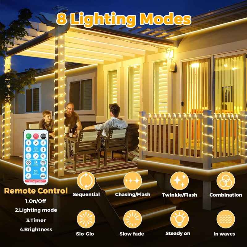 - 🌟【8 Beleuchtungsmodi】: Kombination, Glühwürmchen blinken, Wellen, Verblassen, Lauflicht/Blinken, langsames Verblassen, Funkeln/Blinken und Dauerlicht. So können Sie ganz einfach die perfekte Atmosphäre für jeden Anlass schaffen. Der integrierte Speicher speichert Ihre letzte Einstellung – kein Zurücksetzen nötig.