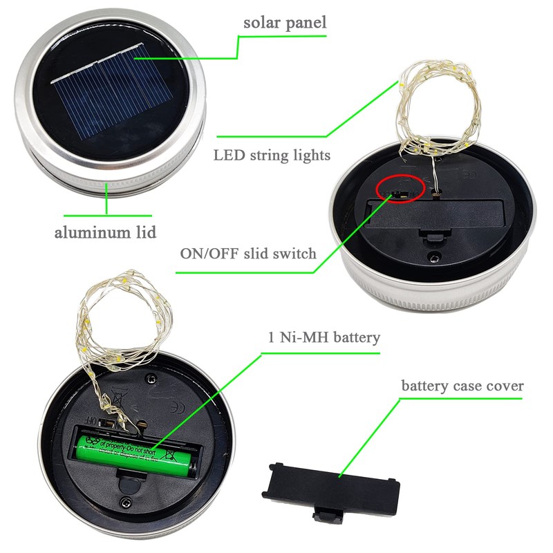 **Specifications** ♥ * ➤The Solar Mason Jar Lid Lights with 20 ultra bright LEDs Powered by solar and working with AAA rechargeable battery.The insert is perfect for DIY, solar walkway lighting, garden/patio/lawn pendant light, solar garden lighting, and creating a perfect summer ambiance for your garden. ➤Pack of 10, 20 Led String Fairy Star Firefly Jar Lids Lights,10 Hangers included(Jars Not Included).Put the solar panels with string lights into the jar lids ring. 2 3⁄8 in (60 mm) inner and 2 3⁄4 in (70 mm) outer diameter.Fits for most Regular Mouth mason jar. Like all Major Brands: Ball,Kerr,Golden Harvest,Kilner and Generic Mason Jars. **♥Specification:** Brand: SmilingTown Light Color: Warm White Mode: Steady (No Flicker) Led Quantity of each Light: 20 Power Source: Solar Charging/ AAA Battery Lid Diameter Size: Lid 2.76""(70mm)/Insert 2.36""(60mm) **♥Notice:** * If you receive the lid lights and find it is not bright, please put the lids under the sun for charging at first. * Please Noticed Each light includes an On/Off switch underneath the lid, Keep it ON before charging by solar. * If there is long time without sunlight, The lights can also working by AAA Battery only. **♥Package includes:** 10 x Solar mason jar lid lights 10 x Stainless Steel Wire Hangers (AAA Rechargeable Battery Included) (Manson Jars are Not Included)
