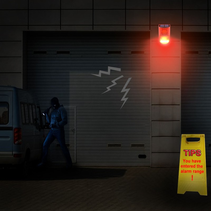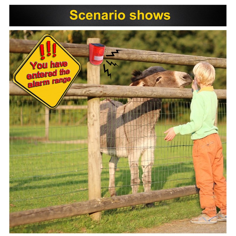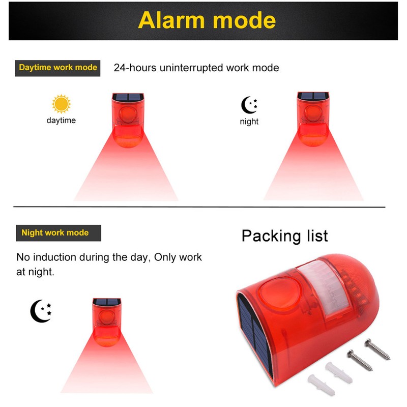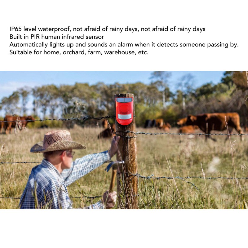 1、IP65 WATERPROOF LEVEL: With a waterproof level of IP65, the solar outdoor motion sensor alarm is able to withstand rainy weather and harsh environments, ensuring its durability and reliability. 2、INTELLIGENT ALARM AND LIGHTING: Equipped with a built in PIR motion sensor, the alarm automatically lights up and emits warning sounds when it detects human movement, providing effective security measures. 3、WIDE SENSING RANGE: With a sensing distance of 5‑8m and a sensing angle of 125 degrees, the alarm provides extensive coverage, ensuring that any suspicious movement is detected. Moreover, it produces a high pitched alarm sound of 129 decibels and flashes warning lights. 4、MULTIPLE WORKING MODES: Offering four different working modes, include a 24h sound and light alarm mode, a 24h silent flashing alarm mode, a night time sound and light alarm mode (inactive during the day), and a night time silent flashing alarm mode. 5、VERSATILE APPLICATIONS: Ideal for use in homes, orchards, farms, warehouses, and other places, the solar motion sensor alarm can also be used to effectively deter and drive away animals and prevent theft and burglary incidents.