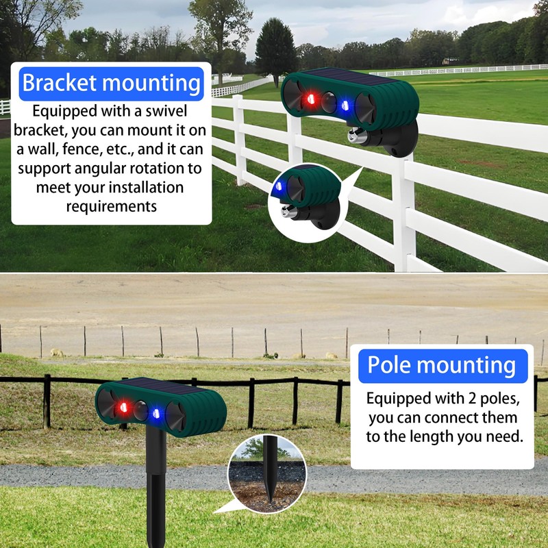 - Easy installation - point the product to the area to be protected, select the desired mode and insert it into the ground. It is a 3 hole screw hanger, and the screws of the light can be hung on objects such as trees, fences and walls for best results. Rod or screw caps can be manually adjusted to adjust the orientation of the scarecrow