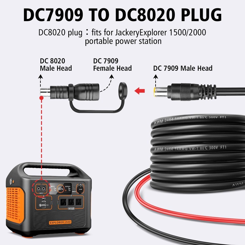 - DC7909 to DC8020/DC5525 Convert Connectors:When to use the Explorer 1500/2000, 300 Plus/600 Plus/1000 Plus/1000 v2/2000 Pro portable power station, please plug the DC7909 to DC8020 connector. When to use the power station with DC5.5*2.5mm port(compatible with DC5521 port), please plug the DC7909 to DC5525 connector