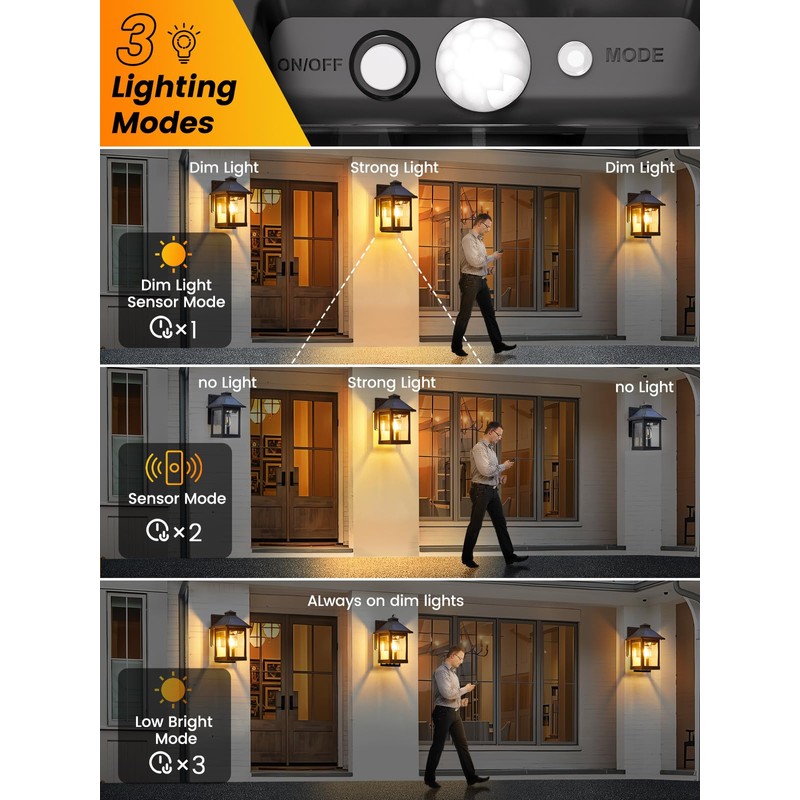 - 【3 Motion Sensor Modes】:The solar outdoor wall lights have 3 lighting modes. Mode 1: gradually shifts from a soft glow to bright when motion is detected at night. Mode 2: instantly switches from dark to bright on motion, ensuring immediate visibility. Mode 3: keeps a steady 30% brightness all night. With an easy "Mode" button press, you can adapt the solar wall lights to any situation. Whether it's a late-night arrival or a relaxing outdoor gathering, you have the perfect lighting option at your fingertips.