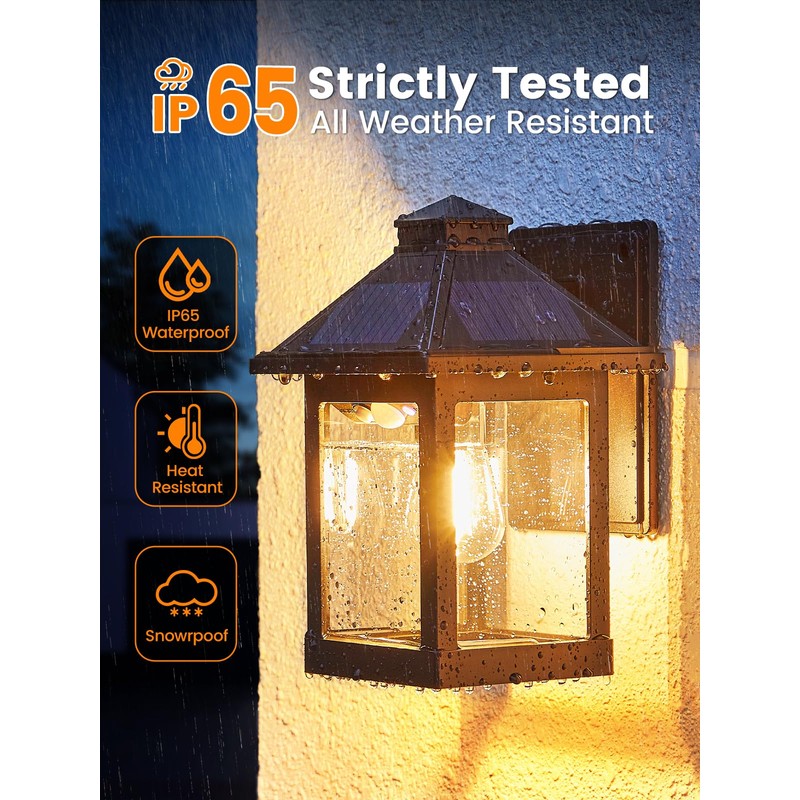 - 【IP65 Waterproof & Durable Material】:The solar porch lights outdoor are meticulously crafted with premium plastic. Likewise, the solar wall lantern has IP65 protection. It resiliently withstands rain, wind, and snow. Its durability is remarkable, remaining stable in fluctuating outdoor conditions. This reliable light not only serves as a decorative element but also endures the test of time, enhancing your house exterior with long-lasting charm and functionality.