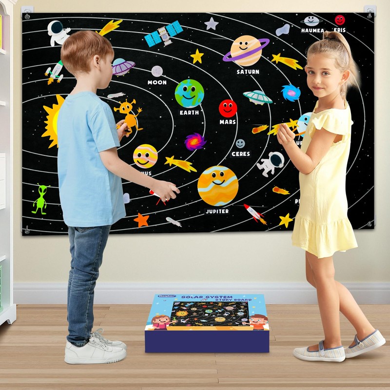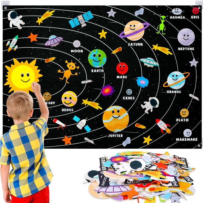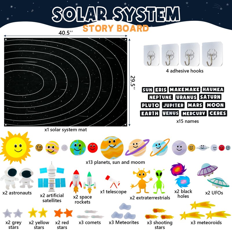 - Solar System for Kids: This is a super fun activity for space loving kid. The felt board have dwarf planets are included, 13 planets for kids solar system toys, the Moon, the Sun, their 15 names, 2 black holes, 2 yellow stars, 2 gray stars, 1 telescope, and 2 artificial satellites and the fun extras like the astronauts, aliens, comets etc. This is a great educational toy/activity if your children love the planets.