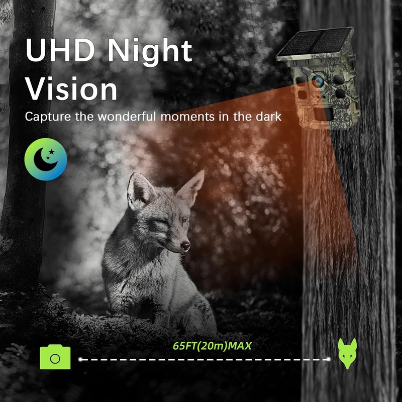 - 【Quick Trigger & Night Vision】0.2s Trigger, 5 Shots: Adjustable PIR sensor for quick triggering, 1-5 continuous shots, silent night vision up to 65ft, camouflage design, captures vivid wildlife details at night (PIR detection up to 70ft).