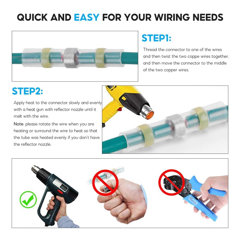 - ✨SAVE TIME The cable connector with a heat shrink tube does not need to be welded or crimped, only a 1500-2000W heat gun (heat gun is not included) is heated evenly to complete the stable connection of the two cables.