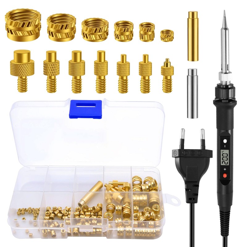 - Multifunctional soldering iron set: you will receive a soldering iron with EU plug, 7 soldering tips specially designed for thread inserts, 1 standard 936 universal soldering tip, total 130 thread inserts. 30 pieces. M2 x 2 x 3.2, 30 pieces. M3 x 4 x 4, 30 pieces. M4 x 4 x 5, 20 pieces. M5 x 4 x 7, 10 pieces. M6 x 5 x 8, 10 pieces. M8*6*10 This is your ideal kit for various applications, especially compatible with 3D printer accessories