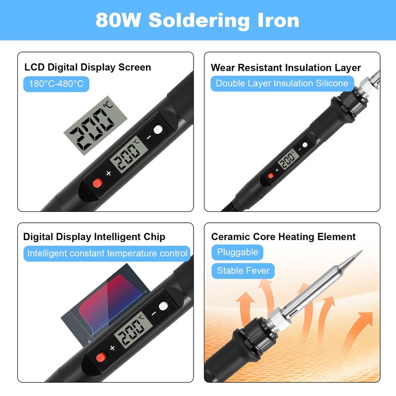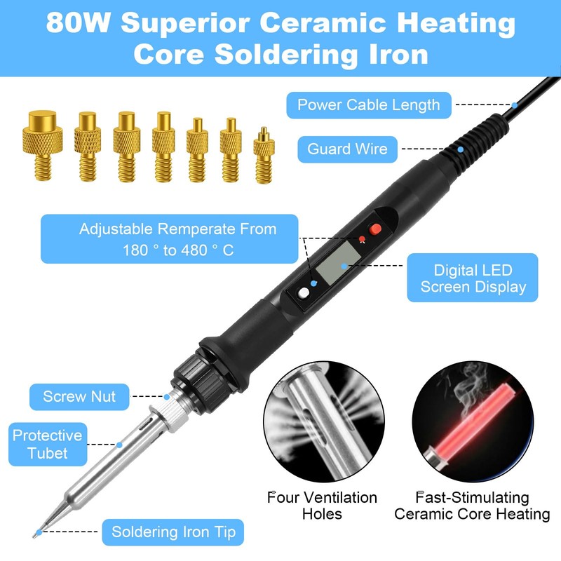 - Upgrade technology: This soldering iron uses ceramic induction heating technology. The soldering iron has a power of 80W and can cause the soldering iron tips to heat up quickly within 15 seconds. This soldering iron can accurately adjust the temperature and a flexible temperature range from 180 to 480 °C. The soldering iron has ventilation holes to ensure better heat dissipation and longer service life, and is able to cool down quickly.
