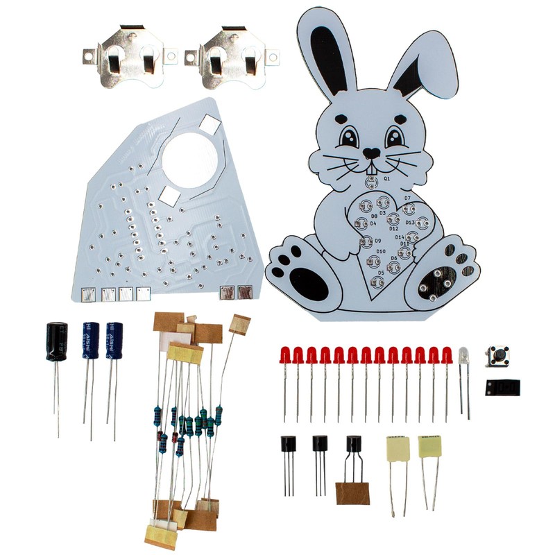 The special feature:The cute rabbit holds a heart of red 3 mm LEDs, which can be made to pulse in two ways: