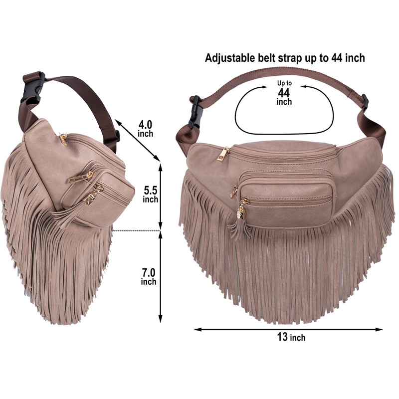 - Multi Compartments - Fringed fanny pack with an adjustable wide waist strap belt. Has two zippered compartments front side and zipper pocket space in back, Also inside zipper pocket and an open pocket.
