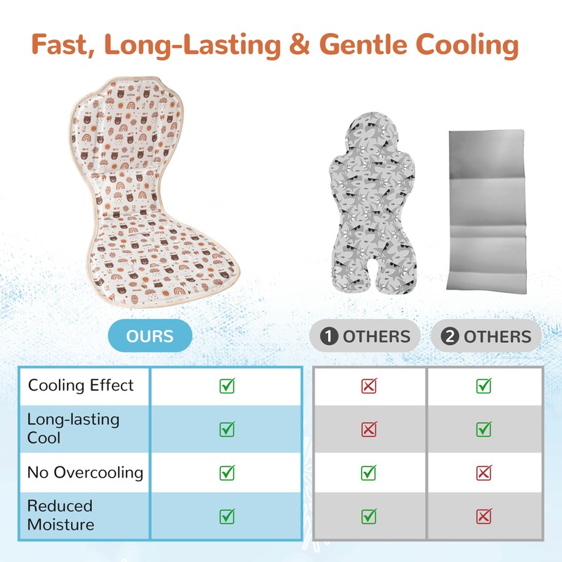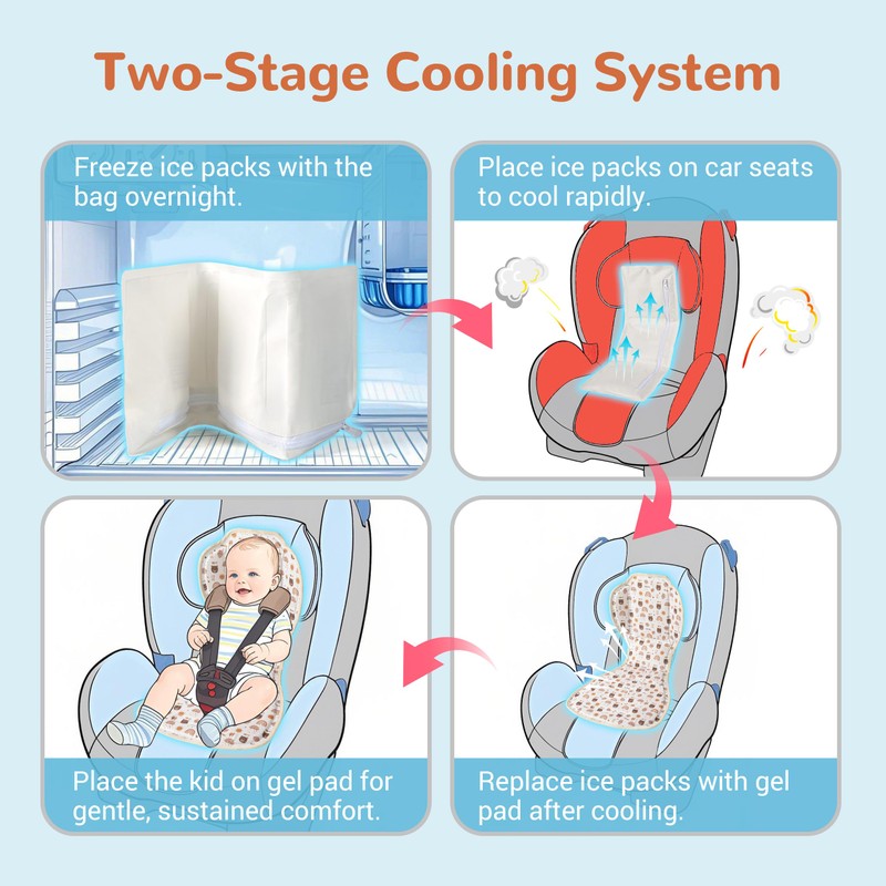 - [ Two-Stage Cooling System ] Begin with the frozen cooling bag with ice packs to rapidly cool scorching car seats, then switch to the gel cooling pad for sustained, gentle comfort. This method prevents overcooling, ensuring a safe and balanced temperature for your little ones.