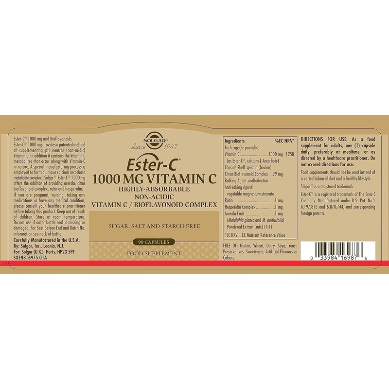- ✓ GENTLE, HIGHLY ABSORBABLE - The metabolites of Ester-C have a positive effect on the levels of vitamin C retention in the body’s immune cells, giving you superior immune support. Solgar’s Ester-C is an exclusive formulation with additional natural plant bioflavonoids, that naturally accompany vitamin C in fruits and vegetables