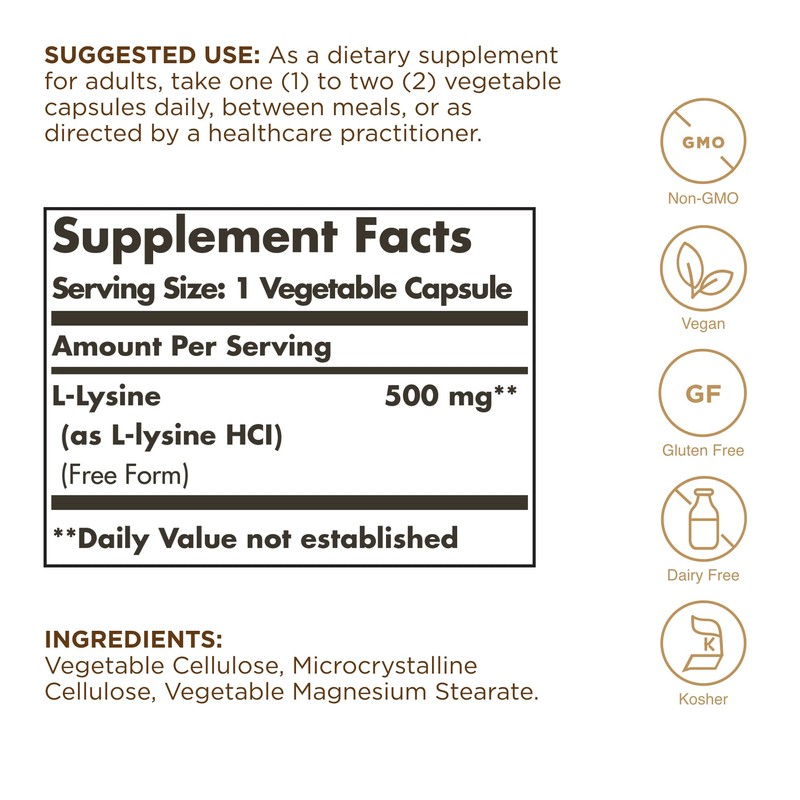 - Non-GMO & Gluten Free; Solgar L-Lysine Vegetable Capsules are suitable for vegans and vegetarians; Free of: gluten, wheat, dairy, soy, yeast, sugar, sodium, artificial flavor, sweetener, and color
