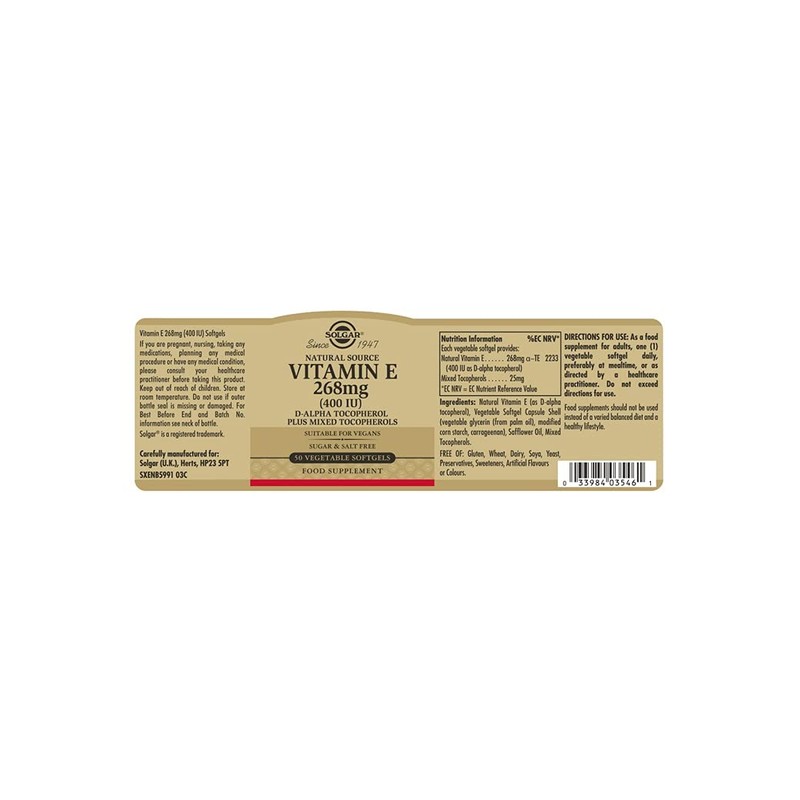 Solgar Natural Source Vitamin E 268 mg (400 IU) Vegetable Softgels, Brown, 50 Count (Pack of 1)