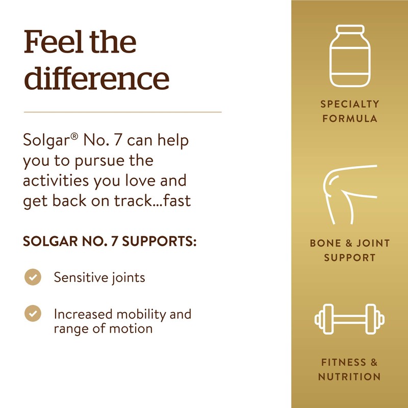 - Easy to Ingest, Once Daily Joint Support; Solgar No. 7 targets multiple pathways to balance the release of joint enzymes, structurally support collagen building blocks and sensitive joint cartilage