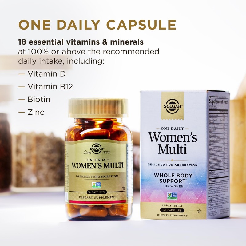 Solgar's One Daily Women's Multi is designed for absorption and formulated for the nutritional needs of today's women. This unique whole body support formula provides highly absorbable forms of key nutrients in a delayed-release vegan capsule, providing 18 vitamins and minerals at 100% (or above) the recommended Daily Value. Our women's one a day capsules aid in immune health? with Zinc bisglycinate and antioxidants like Vitamin C. Not only that, but they also provide energy and stress management? with B-vitaminsincluding B12 as Methylcobalamin, breast and reproductive health? with Vitamin D3, Iron and Folic Acid and hair, skin and nail support? with 100% of the Daily Value of Biotin along with antioxidants like Vitamin C & E and Mixed Tocopherols. All of this nutrition is delivered in one vegan capsule a day. ?These statements have not been evaluated by the Food and Drug Administration. This product is not intended to diagnose, treat, cure or prevent any disease.