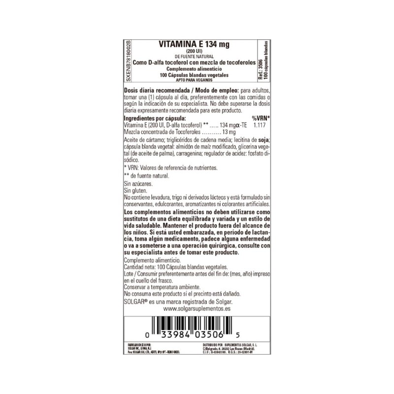 Solgar Vitamin E 134mg 200 UI 50 Vegetable Softgels