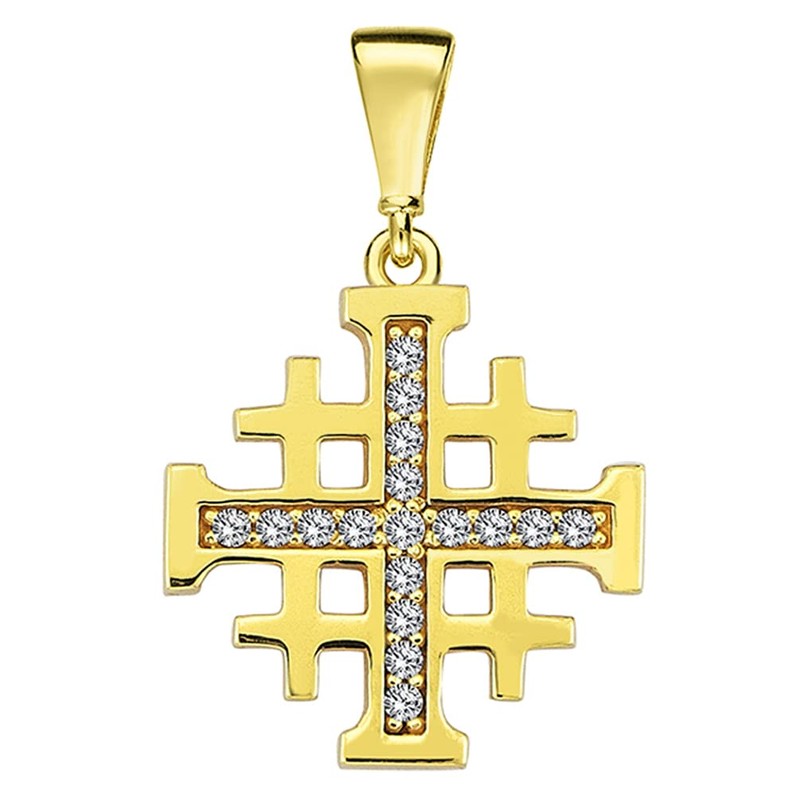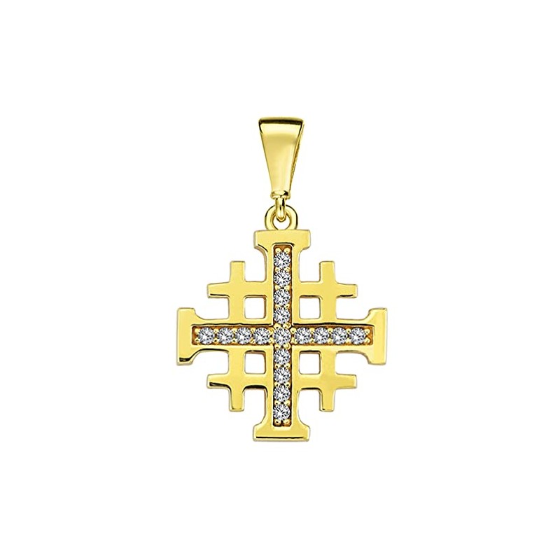 Solid 14k Yellow Gold Religious Crusaders Jerusalem Cross Pendant with Cubic-Zirconia
