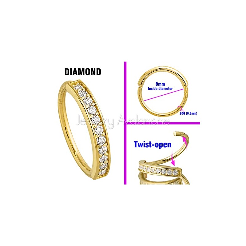 Solid 20G 14Kt Yellow Gold Prong Set 11-Stone Diamond Nose Hoop Ring - Ear Cartilage Ring - April BirthStone Nose Ring Stud - 11PRS11WDYG