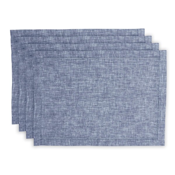 Solino Home Linen Placemats 19" L x 14" W Inch – 100% Pure Linen Hemstitch Chambray Indigo Placemats Set of 4 – Milan, Cloth Fabric Placemats for Spring, Winter