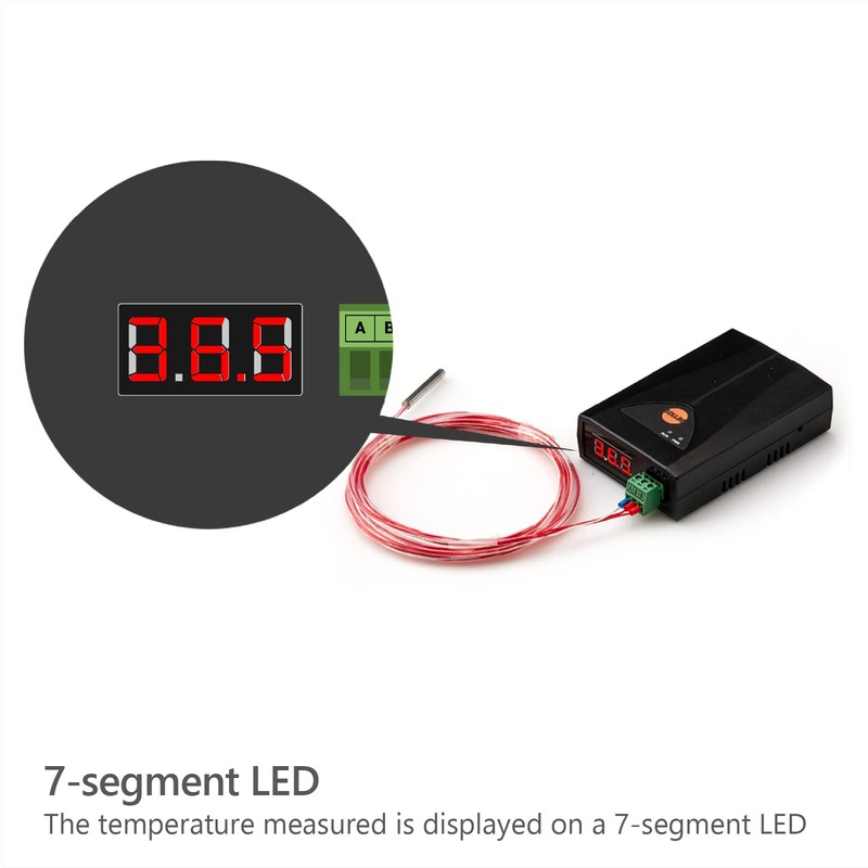 - PT100 connection port (support 3-wire PT100 sensor) and a red 3-digit 7-segment LED display