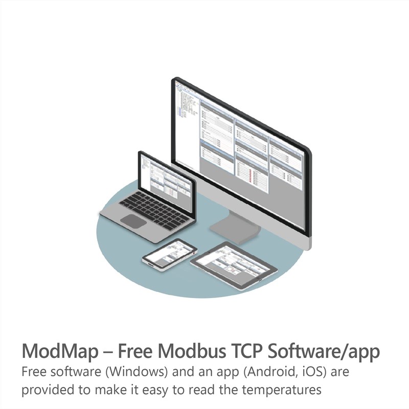 - Device reads temperature from PT100 and sends it to network using Modbus TCP protocol