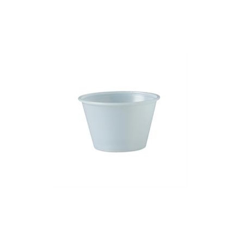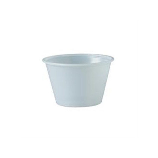 This SOLO P400-0100 4-oz. translucent plastic soufflé portion cup measures 2.9 x 1.8 inches (Dia x H) and is suitable for serving cold dips and sauces. (Dia is diameter, the horizontal distance from one side to the other; H is height, the vertical distance from bottom to top.) The container is made of polystyrene for strength and flexibility. This 4-oz. translucent plastic cup is suitable for use in a variety of food service settings.