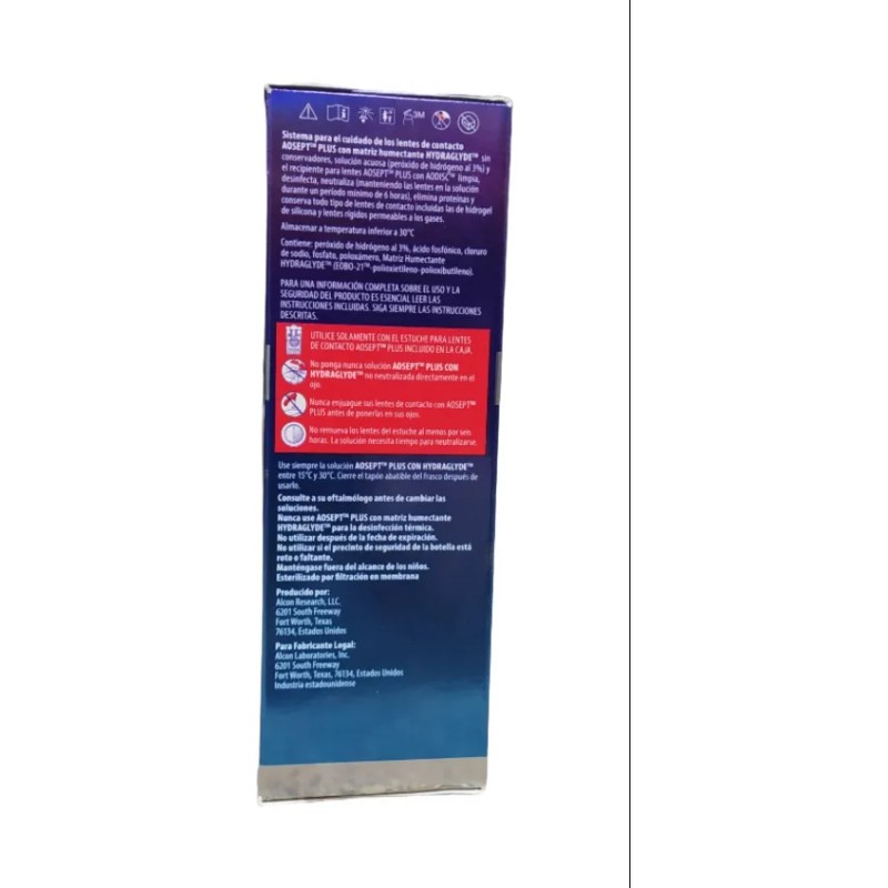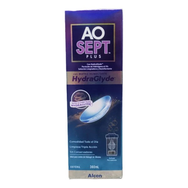 Sistema de mantenimiento para lentes de contacto. AOSEPT PLUS con Matriz humectante HYDRAGLYDE. Solución acuosa sin conservantes, con peróxido de hidrógeno al 3%, ácido fosfónico (estabilizador), cloruro de sodio, fosfato (solución tampon fosfato), poloxámero (surfactante) y estuche para lente AOSEPT PLUS con AODISC.