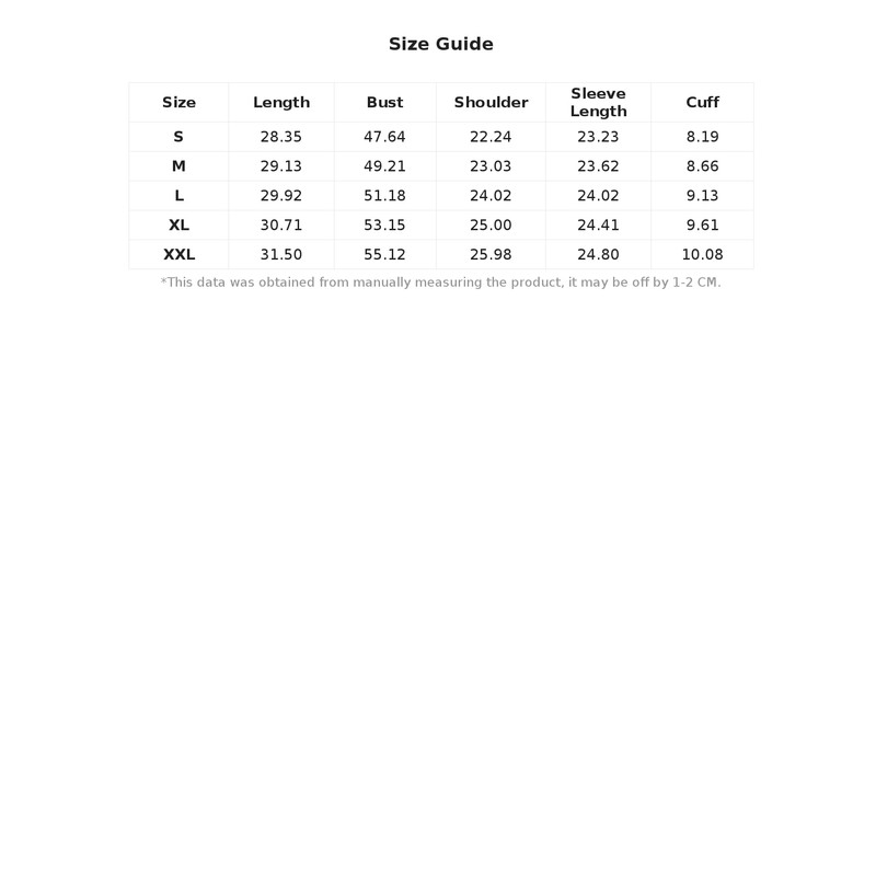 L:Sleeve Length:24.0IN,Cuff:9.1IN,Bust:51.2IN,Shoulder:24.0IN,Length:29.9IN