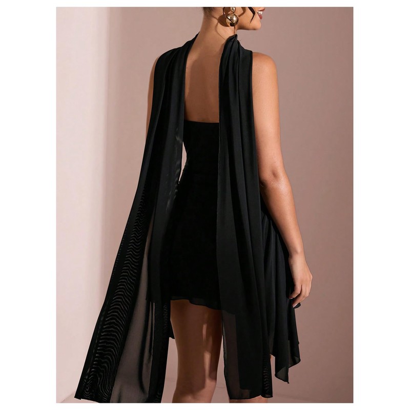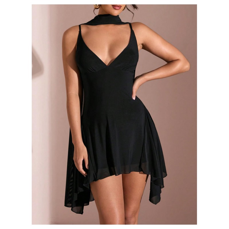 - Design: Mesh dress for women features irregular ruffle hem, deep v neck, low cut, sleeveless, scarf, solid color, short length