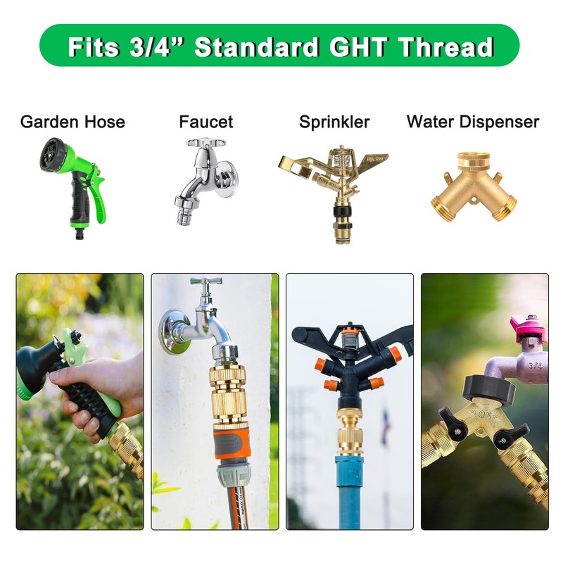 - Durable Brass 3/4 GHT Garden Hose Connector: Made of solid brass for corrosion and rust resistance, this standard-sized quick connect hose fittings outlasts plastic or aluminum alternatives, ensuring a leak-free connection. It fits all standard garden hoses in North America, providing a seamless and easy-to-use experience. (Note: For a leak-proof seal, pair with NH female threads.)