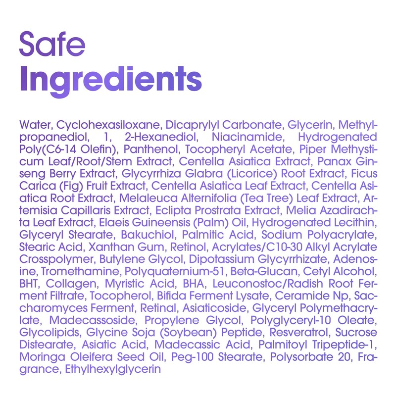 - RETINOL SERUM : The Retinol Serum offers a safe and powerful skin improvement effect with its Re-active technology that is gentle on sensitive skin that has been sensitized by frequent damage. This facial serum contains Retinol 0.1%, Retinal 1ppm, and Bakuchiol 5,000ppm, which promote the synthesis of collagen and elastin in the skin. This daily serum also includes Panthenol, Beta-glucan, Ceramides, and Trucica to help with damaged skin recovery and strengthen the skin barrier