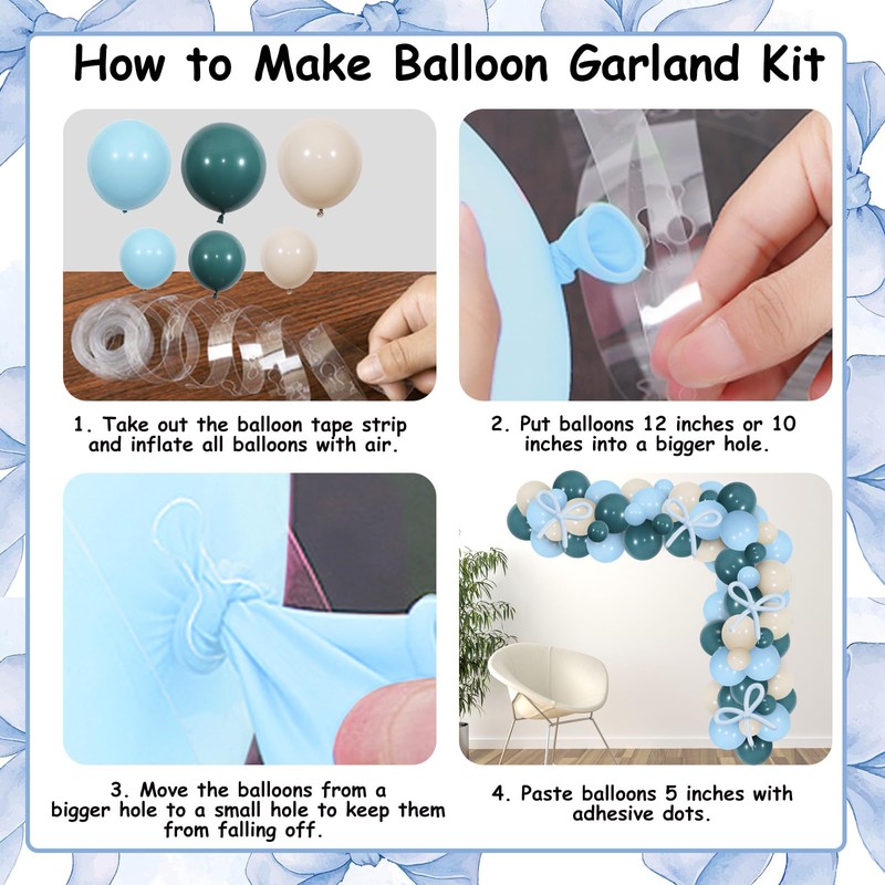 - Easy Installation: As for assembling balloon garland or arch, only to insert balloons into the holes on the balloon tape and use the adhesive dots to fix the 5-inch balloons around the 12-inch balloons in different colors to fill in the gaps. It will not fall out with a set of holes.