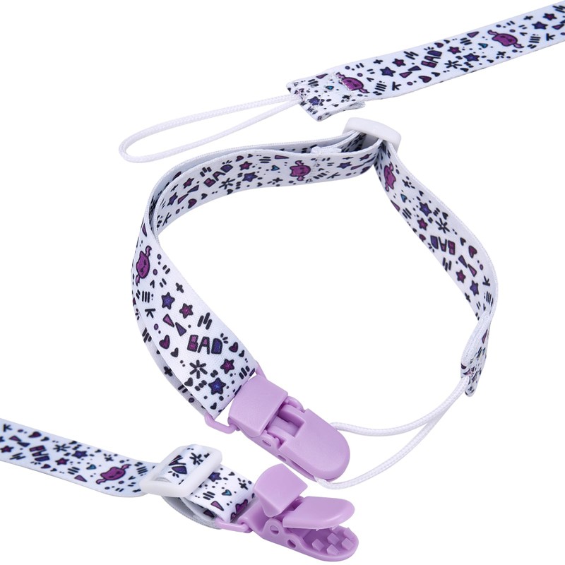 - Adorable and Unique Design: The pacifier lanyard features a cute and playful design with a variety of charming elements. It includes purple stars, hearts with the "BAD" character, a triangular background, bats, a rock 'n' roll rabbit, windmills, bones, and a puppy. This whimsical design adds a fun and trendy touch to the product.